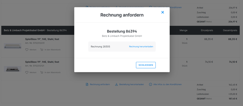 Über das Admin Portal kann eine Mail ausgelöst werden, um dem Kunden eine aktuelle Übersicht seines Bedarfes zukommen zu lassen.